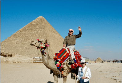 Later on that day we paid an extended visit to one of the most stunning of all monument complexes in Egypt, the pyramids of Giza and the Sphinx. This site is located at the very desert edge of the Giza suburb of Cairo. The innumerable pictures we have all seen of these pyramids do not do justice to their awesome appearance when standing nearby. There is a basic beauty to these structures because of their essential design purity and simplicity. I entered the shaft of the second largest pyramid all the way to the centrally located funerary chamber. A long crouching descent in a stiflingly impure atmosphere which Evelyn chose to forgo. Outside, we were cajoled into camel photography by a wily Tourist-attuned Egyptian. It was my first camel riding – rather, sitting – experience. One must hold on for dear life when the animal rises or lowers itself, lest you fall over its head.