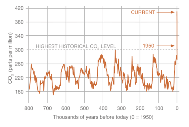 The highest ever level of 300 ppm during the last 800,000 years was about 340,000 years ago. This was exceeded just before 1950. In February 2021 the concentration is rising through 415 ppm[2]. On the long term historical record scale shown above, this is represented by an almost vertical line.