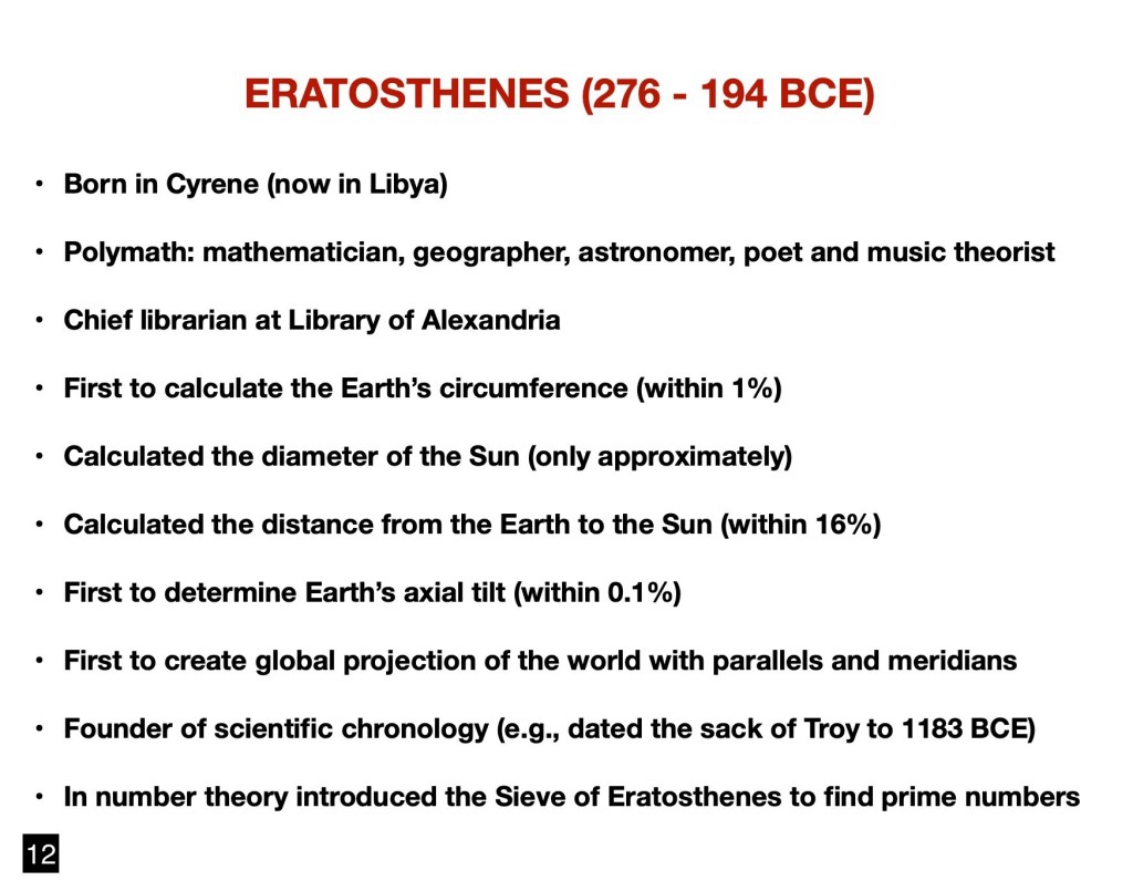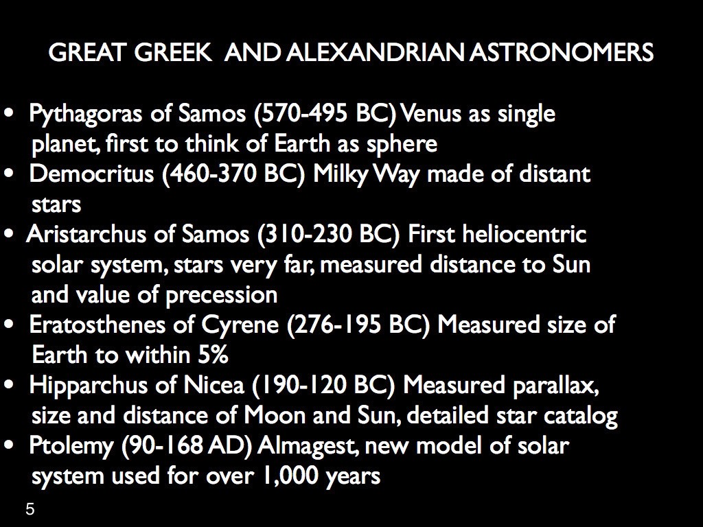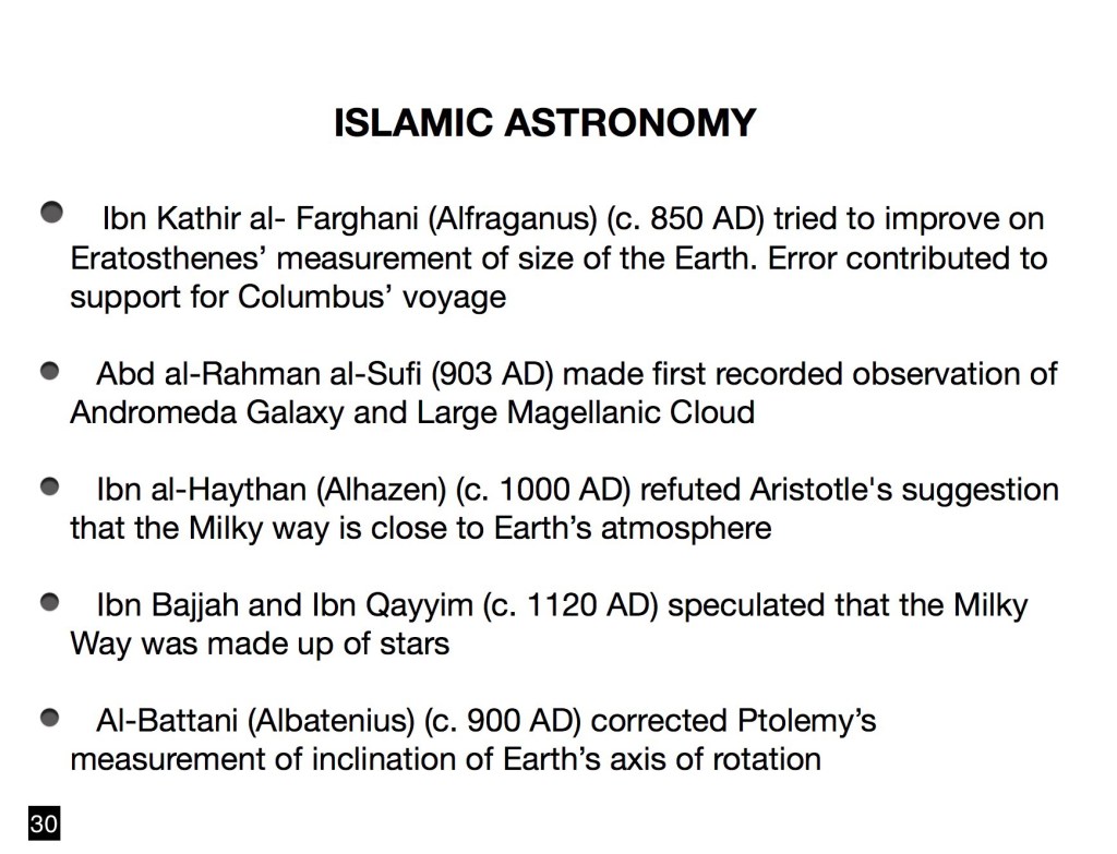 I have chosen to begin this summary with the very first truly scientific treatment of astronomy which was achieved in the Hellenistic world. I am referring to the achievements of what I call The Three Musketeers of Ancient Greek astronomy: Aristarchus of Samos, Eratosthenes of Cyrene and Hipparchus of Nicaea. Their contributions were to be foundational to future developments. To summarize, limiting their accomplishments to the most salient: 1. Aristarchus formulated the first heliocentric solar system, preceding Copernicus by over 1,800 years; 2. Eratosthenes measured the size of the Earth within about 1% of its true size; and 3. Hipparchus determined the size of the Moon and the Sun as well as the distance to the Moon within a few percent, using the method of parallax which is still applied at present to measure the distances within our Milky Way galaxy. Thereafter, however, further progress can be viewed as having derailed. Aristarchus’s heliocentrism was disregarded as the authoritative Aristotle predicated a rigid and dogmatic geocentrism which was to persist for the next millennium and a half in the western world, principally because it was embraced by the Catholic church.