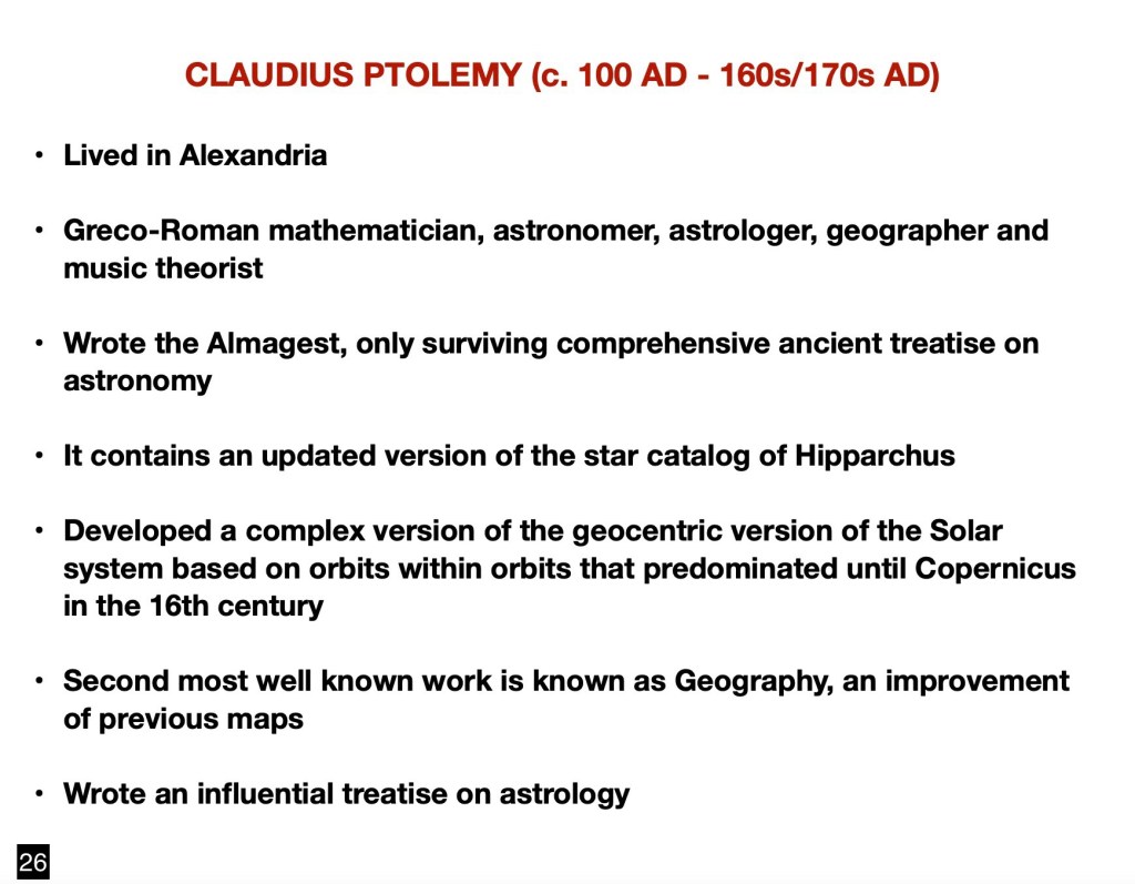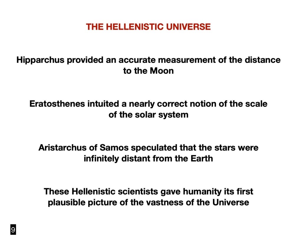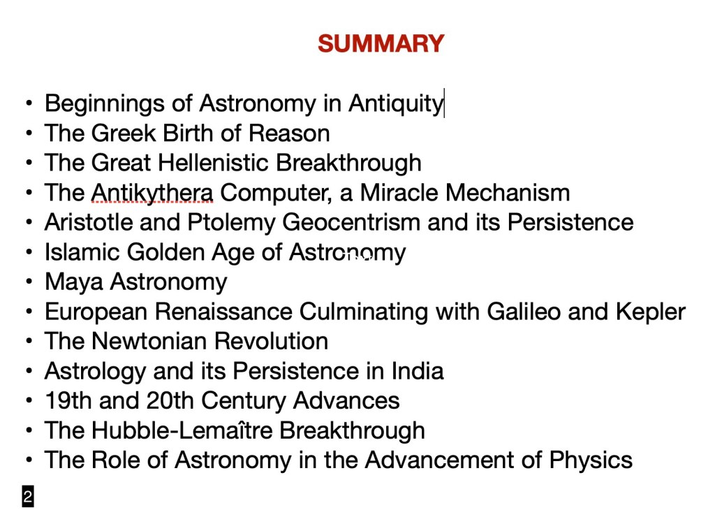 The contents of this class are to be considered an attempt at summarizing a vast subject bracketed by the breakthroughs of the Hellenistic Greek insights between about 300 BCE and 100 BCE, and the Hubble/Lemaître discovery in the 1920s.