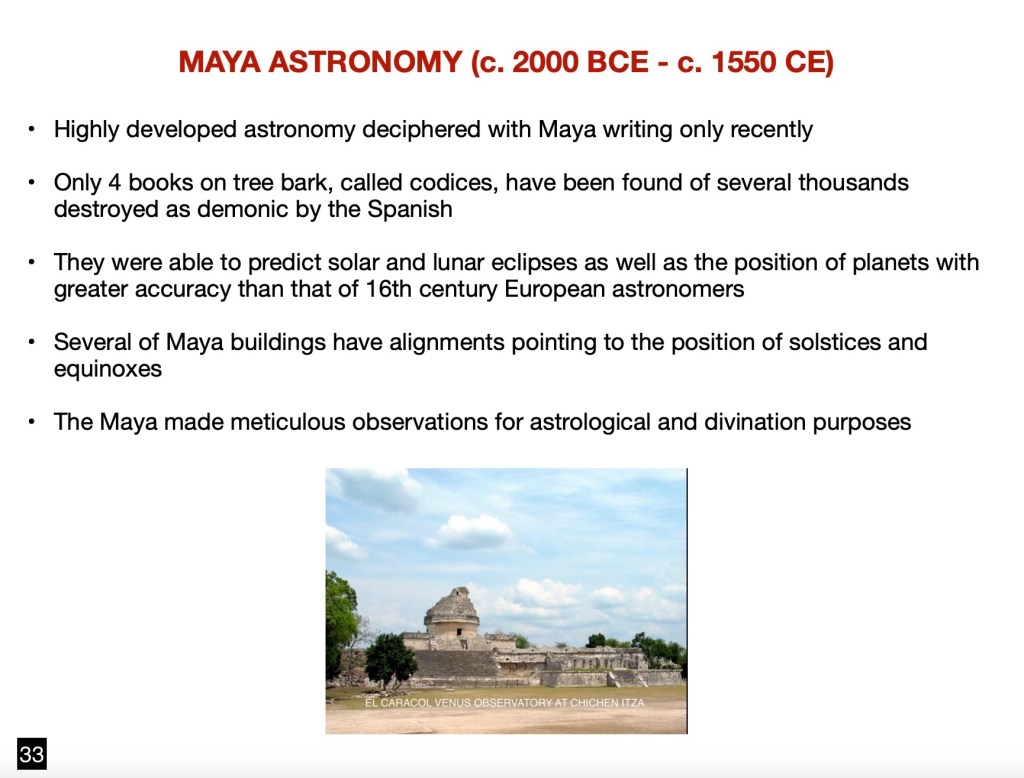 The Maya observational skills of star locations merit special mention: their precision exceeded that of the early 16th century European, the time of the obliteration of that Central American culture at the hands of the Spanish conquerors.