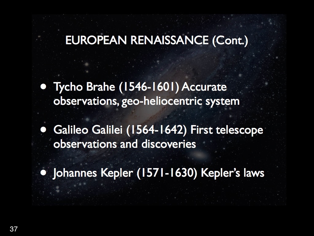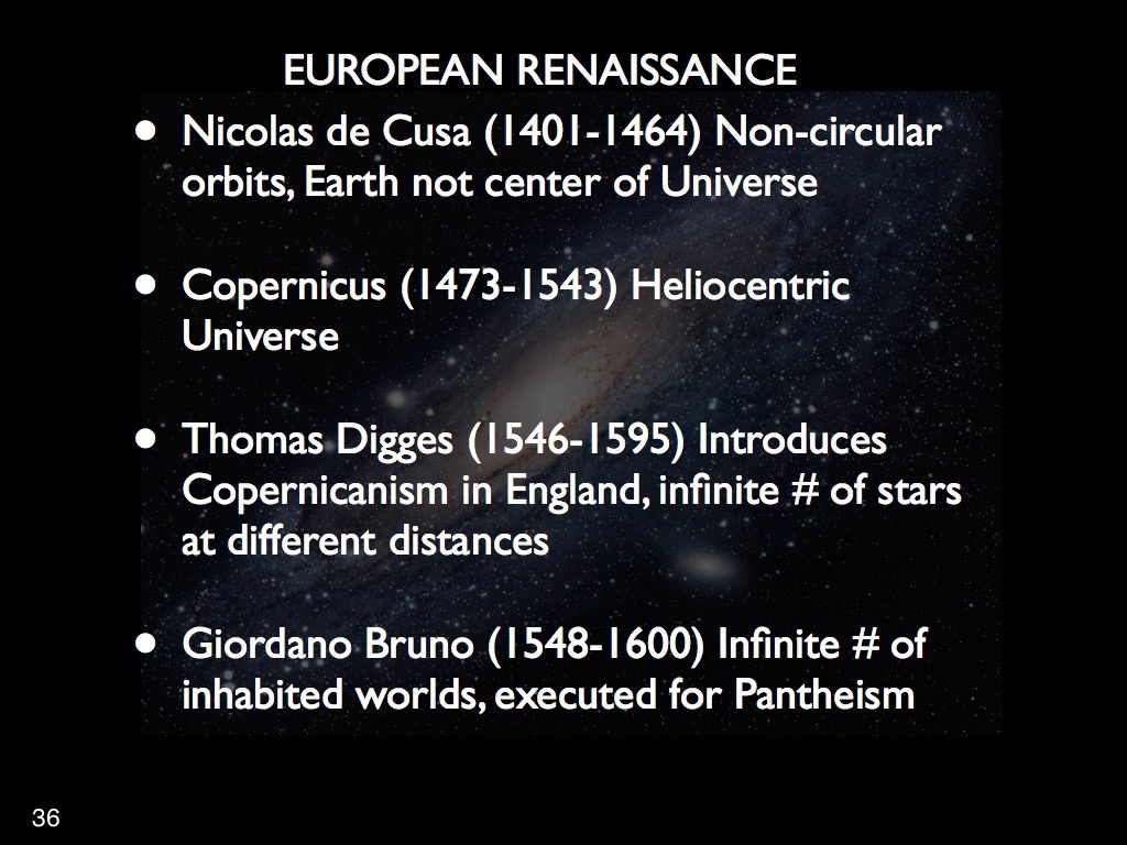 With the waning of the Islamic Golden Age we have reached a pivotal point in this narrative: the dawning of the European Renaissance. This rebirth, in my view, was principally embodied by Nicolas de Cusa, a German polymath and Catholic bishop (he became a cardinal in1448), who was the first proponent of Renaissance Humanism. His works cover a wide range of subjects but in what pertains to astronomy, he affirmed that the Earth is a star like other stars, is not the centre of the universe, is not at rest, nor are its poles fixed, the celestial bodies are not strictly spherical, nor are their orbits circular, and also wrote about the possibility of the plurality of worlds. These ideas would probably have been labelled as heretical a century later but, apparently, were not considered as such in mid-15th century. My view is that the expansion of the influence of the Inquisition and the advent of the Reformation subsequently hardened the attitude of the Vatican which became thoroughly intolerant of such heterodox ideas.