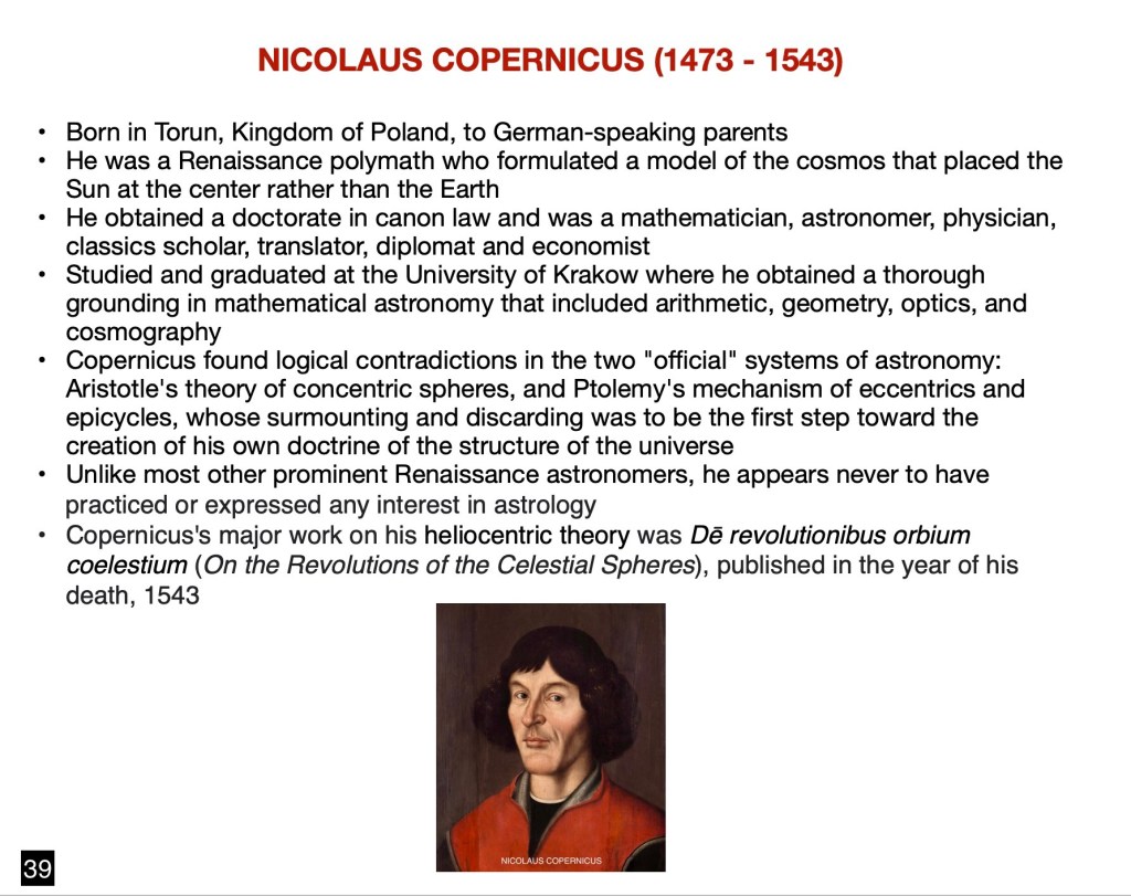 The next momentous step was achieved by Nicolaus Copernicus. It was the first crucial inroad destined to displace and replace the Aristotelian geocentric universe that had reigned in various incarnations for hundreds of years. A Polish polyglot and polymath, Copernicus obtained a doctorate in canon law and was a mathematician, astronomer, physician, classics scholar, translator, governor, diplomat, and economist. A doctorate in Canon Law, or Juris Canonici Doctor (J.C.D.), is the highest degree in the study of the Catholic Church’s legal system.