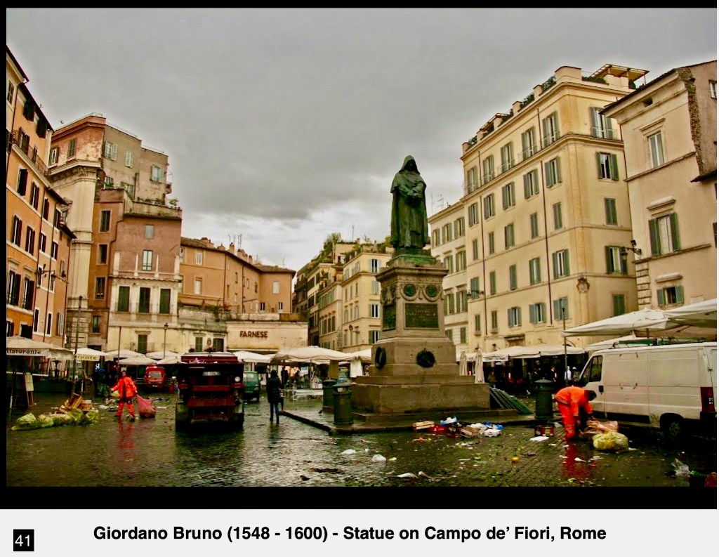 Italian philosopher, poet, alchemist, astrologer, cosmological theorist, Bruno is known for his cosmological theories, which included the embrace of the Copernican model. He practiced Hermeticism and gave a mystical stance to exploring the universe. He proposed that the stars were distant suns surrounded by their own planets (now called exoplanets), and he raised the possibility that these planets might foster life of their own, a cosmological position known as cosmic pluralism. He also insisted that the universe is infinite and could have no centre. These advanced ideas and his theological views such as denial of several core Catholic doctrines, including eternal damnation, the Trinity, the deity of Christ, the virginity of Mary, transubstantiation and Bruno’s embrace of pantheism led the Inquisition to find him guilty of heresy, and he was burned at the stake in Rome’s Campo de’ Fiori in 1600.