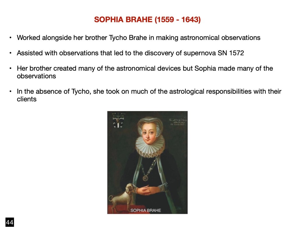 I had started on that quest with Sophia Brahe and the next one I will address is Elizabeth Hevelius, the spouse of Johannes Hevelius, a Polish astronomer of international repute who lived in the second half of the 17th century. Elizabeth assisted her husband in performing observations through several large telescopes that he owned. She was self taught in Latin and was thus able to correspond with fellow astronomers. Following Johannes’s death she undertook the completion and publication, in 1690, of Elements of Astronomy that included a catalog of 1,564 stars. Elizabeth’s contributions were both quantitative and qualitative with a meticulous and systematic approach to astronomical research.