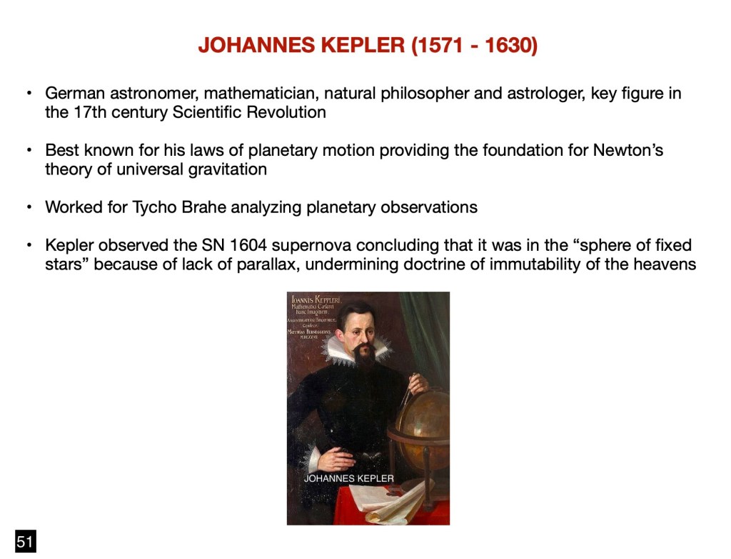 I had mentioned the name Johannes Kepler in his role of assistant to Tycho Brahe, the great Danish astronomer, during the waning years of the 16th century. We will now consider the remarkable contributions to astronomy by Kepler which, in combination with those of Galileo, were to set an entirely new course for that science. Kepler was an an avowed heliocentrist, in protestant Germany, thus shielded from Roman Catholic persecution. He had been in communication with Galileo and shared ideas with the Italian astronomer. Johannes Kepler was a German astronomer, mathematician, natural philosopher, astrologer, key figure in the 17th century Scientific Revolution. Kepler Kepler incorporated religious arguments and reasoning into his work, motivated by the conviction and belief that God had created the world according to an intelligible plan that is accessible through the natural light of reason. For many years he attempted to find a geometric foundation to the orbits of the planets, based on nested