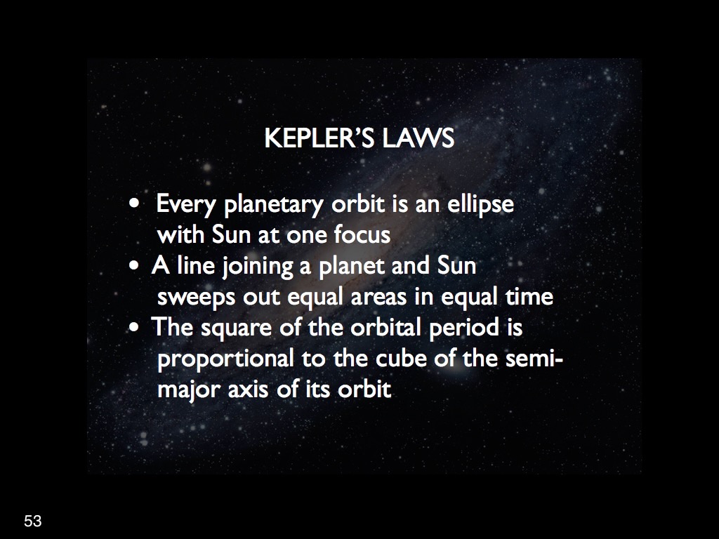 Kepler observed the SN 1604 supernova and concluded that it was located in the sphere of fixed stars and not within the solar system because of the lack of observed parallax, thus undermining the Aristotelian doctrine of the immutability of the cosmos. Kepler is best known for his three laws of planetary motion which provided the foundation for Newton’s Theory of Universal Gravitation. These three laws were as follows: The orbit of a planet is an ellipse with the Sun at one of the two foci. A line segment joining a planet and the Sun sweeps out equal areas during equal intervals of time. The square of a planet’s orbital period is proportional to the cube of the length of the semi-major axis of its orbit.