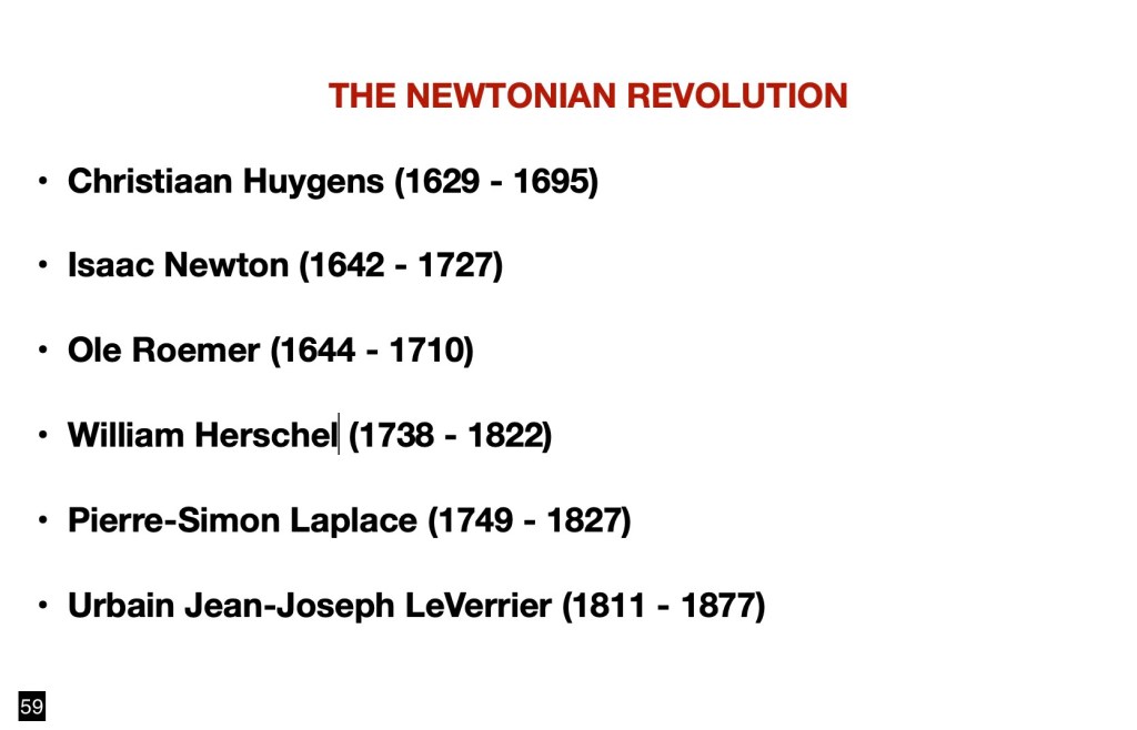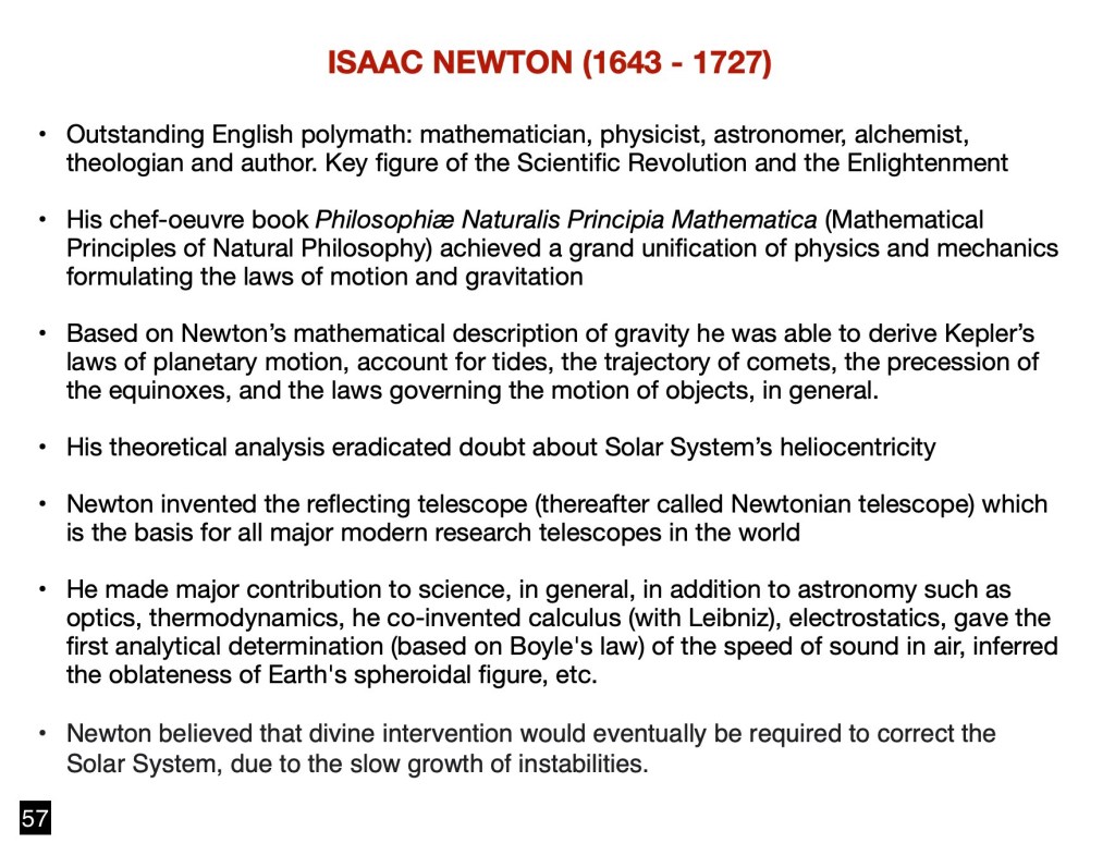 Newton occupies a particularly exalted position in that his main contribution to astronomy provided a springboard for much of its progress until the present. The calculations underlying most of the orbital space explorations, since the second half of the 20th century, are based on the equations developed by that remarkable English polymath. He remains, in the company of Albert Einstein, a true genius of the physical sciences.
