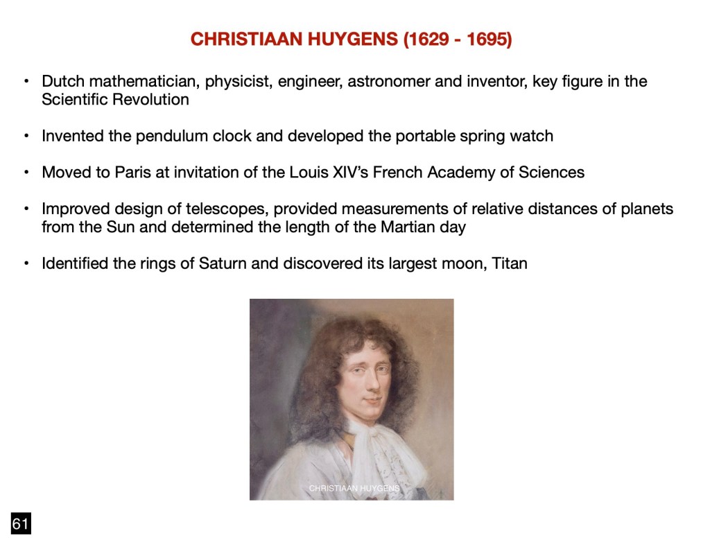 Nearly contemporaneous with Newton we must cite a notable Dutch astronomer, Christiaan Huygens, who was called upon to join the French Academy of Sciences at invitation of King Luis XIV.