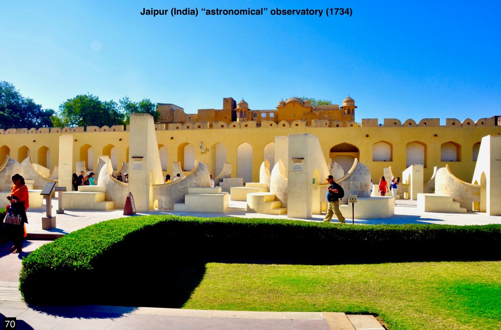 At this juncture I will take the liberty to digress from the chronological sequence in this historical progression of astronomy, and mention — somewhat derisively — a pursuit that in Antiquity propelled the study of the cosmos and later became a parallel endeavor to astronomy, namely astrology. During the Renaissance and, in Europe, until about the end of the 17th century, astrology played an important role in the observation of the heavens and provided vital income to the astronomers who practiced it, some of which questioned its scientific validity. Outside of Europe, however, astrology has not followed the demise of other, so called, occult sciences such as alchemy, and it may even have had a revival such as in the U.S. perhaps propelled by New Age fads. Even more surprising, to me at least, has been the pervasive persistence of astrological beliefs in countries such as India and China. This fact was made blindingly obvious to me when I traveled through India with my spouse in 2016. In at least one of the luxurious hotels we stayed at there was an astrology desk provided for the consultation of the guests. Equally surprising to me was when our guide took us on a visit to what was touted as a historical “astronomical observatory” in the city of Jaipur, the capital of the state of Rajasthan in northwest India. To my shock and astonishment the sprawling “observatory” had no telescope whatsoever although it had been founded in 1734 when such indispensable instruments were considered essential in the European realm. This complex, is described as follows in its Wikipedia entry: “The Jantar Mantar is a collection of 19 astronomical instruments… It features the world’s largest stone sundial, and is a UNESCO World Heritage Site… The instruments allow the observation of astronomical positions with the naked eye. The observatory is an example of the Ptolemaic positional astronomy which was shared by many civilizations”. This description obscures the fact that this “observatory” was used principally for astrological purposes since it could not perform as an installation for meaningful 18th century astronomy. It was, as Wikipedia states, about a millennia and a half (Ptolemaic astronomy) behind the times.