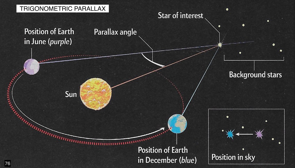 Reference has been made above to the term parallax. Again, here is the relevant Wikipedia definition: “In astronomy, parallax is the apparent shift in position of a nearby celestial object relative to distant background objects which is caused by a change in the observer’s point of view. This effect is most commonly used to measure the distance to nearby stars from two different positions in Earth’s orbital cycle, usually six months apart. By measuring the parallax angle, the measure of change in a star’s position from one point of measurement to another, astronomers can use trigonometry to calculate how far away the star is.