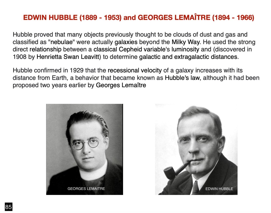 As described in Wikipedia: “Georges Henri Joseph Édouard Lemaître (17 July 1894 – 20 June 1966) was a Belgian Catholic priest, theoretical physicist, and mathematician who made major contributions to cosmology and astrophysics. He was the first to argue that the observed recession of galaxies is evidence of an expanding universe and to connect the observational Hubble–Lemaître law with the solution to the Einstein field equations in the general theory of relativity for a homogenous and isotropic universe. That work led Lemaître to propose what he called the “hypothesis of the primeval atom”, now regarded as the first formulation of the Big Bang theory of the origin of the universe”. Lemaître published these conclusions in 1927.