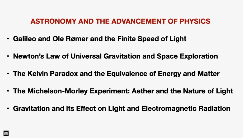 This discovery of the finite speed of light is one example of the crucial role of astronomy in the advancement of the physical sciences.