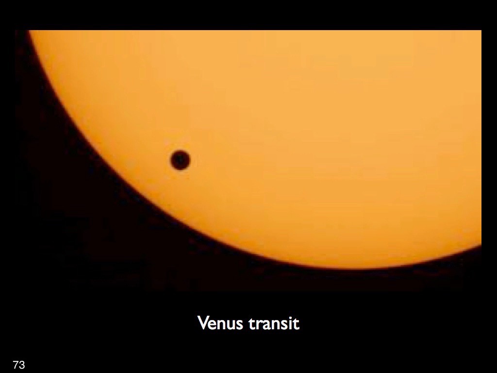 Such transits are observed when a planet, such as Venus, passes in front of the Sun, thus becoming visible as a dark spot on the face of the Sun. If that passage is observed simultaneously from two distant locations on Earth, the difference between the timing of those observations can be used for parallax determinations and, hence the distance to Venus and the Sun. Once such distances are obtained, applying Kepler’s third law it is possible to calculate distances to all the planets of the Solar System. Such observations of Venus transits where then performed with increasing accuracy during the 1700s. It is worth mentioning that the transit method is presently the most frequently used method to detect the presence and size of exoplanets.