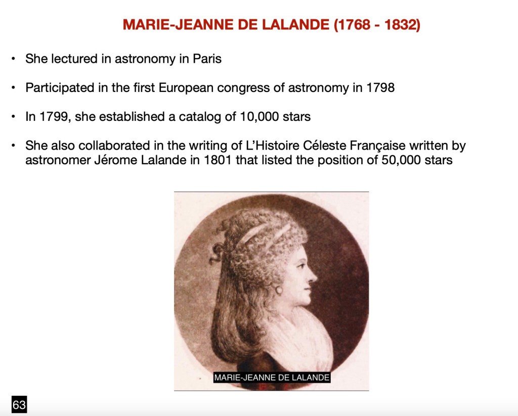 Resuming my acknowledgment of notable women astronomers, we must mention Marie-Jeanne de Lalande, daughter of well known astronomer Jérôme Lalande. She lectured in astronomy in Paris and during the French Revolution, the chief of the Paris Observatory, Dominique, comte de Cassini, asked Marie-Jeanne for help. She taught Cassini’s son and helped him make his first observations of at the Collège de France.