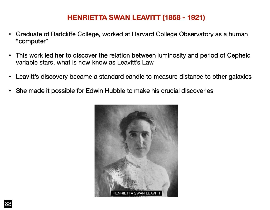 We must now give due credit to a notable woman astronomer in the context of the Cepheid variable stars mentioned above: Henrietta Swan Leavitt (1868 – 1921). She was a graduate of Radcliffe College and subsequently worked at Harvard College Observatory as a human “computer” analyzing photographic records of astronomical observations. This work led her to discover the relation between luminosity and period of Cepheid variable stars, what is now know as Leavitt’s Law. She made it possible for Edwin Hubble to make his crucial discoveries. Leavitt’s discovery became a standard candle to measure distance to other galaxies. The Cepheid method became the second rung (parallax being the first) in the cosmic distance ladder in the multi-step method astronomers use to measure vast distances in space by building upon different techniques for increasingly distant objects, with each rung confirming the one below it.