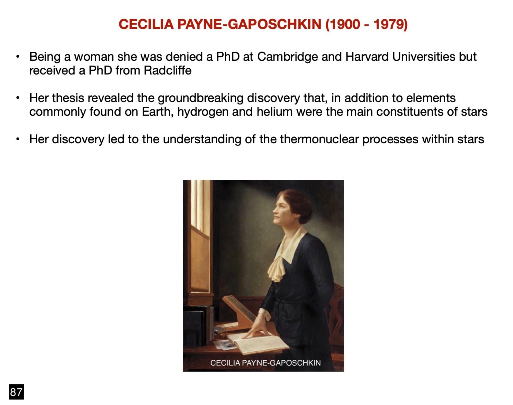 Full recognition for her important contribution to astronomy and astrophysics must go to Cecilia Payne-Gaposchkin (1900 – 1979) who, being a woman, was denied a PhD at Cambridge and Harvard Universities but received a PhD from Radcliffe. Her thesis revealed the groundbreaking discovery that, in addition to elements commonly found on Earth, hydrogen and helium were the main constituents of stars. Her discovery led to the understanding of the thermonuclear processes within stars wherein their main sequence source of energy is generated by fusion of hydrogen into helium in their core.